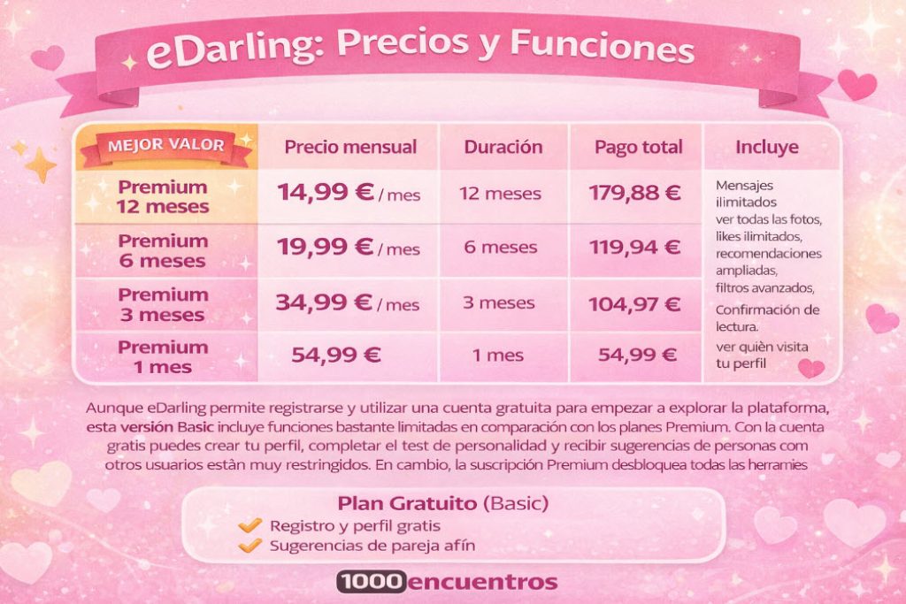 Aunque puedes registrarte gratis, la mayoría de funciones importantes están incluidas en los planes Premium. Y aquí viene lo que de verdad interesa: cuánto cuesta eDarling en 2026.